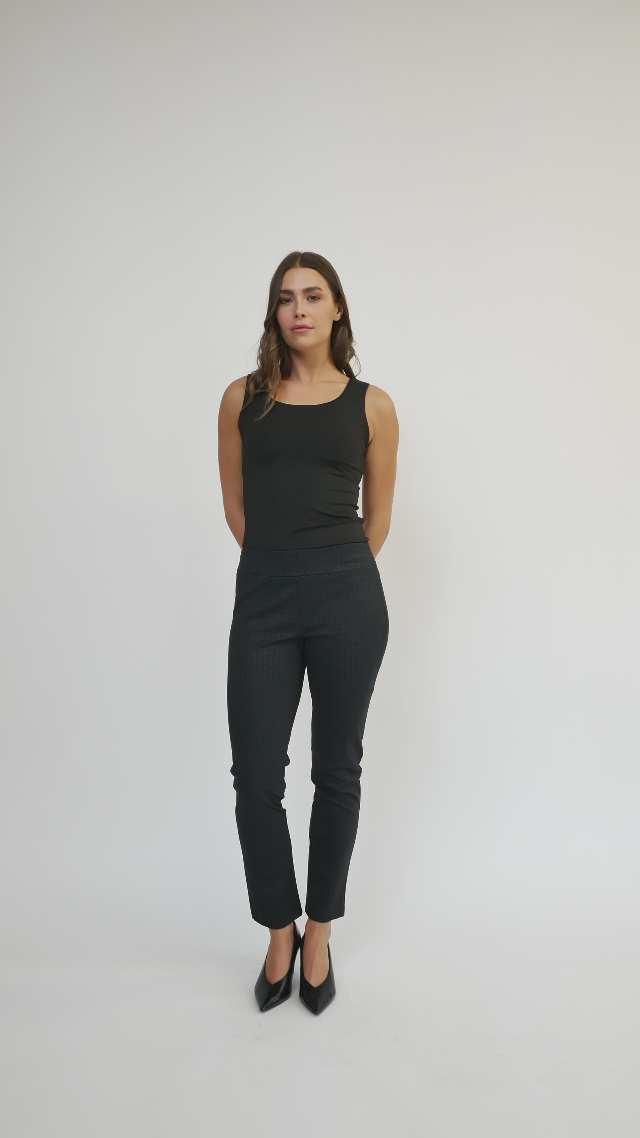 These chic slim leg pants feature an effortless pull-on design with a hidden elastic waistband for all-day comfort. Crafted from luxurious Ponti di Roma fabric that moves with you, they showcase a timeless check print that pairs with everything. The streamlined silhouette flatters petite frames perfectly. Slip them on and go—comfort meets style in one fabulous package!