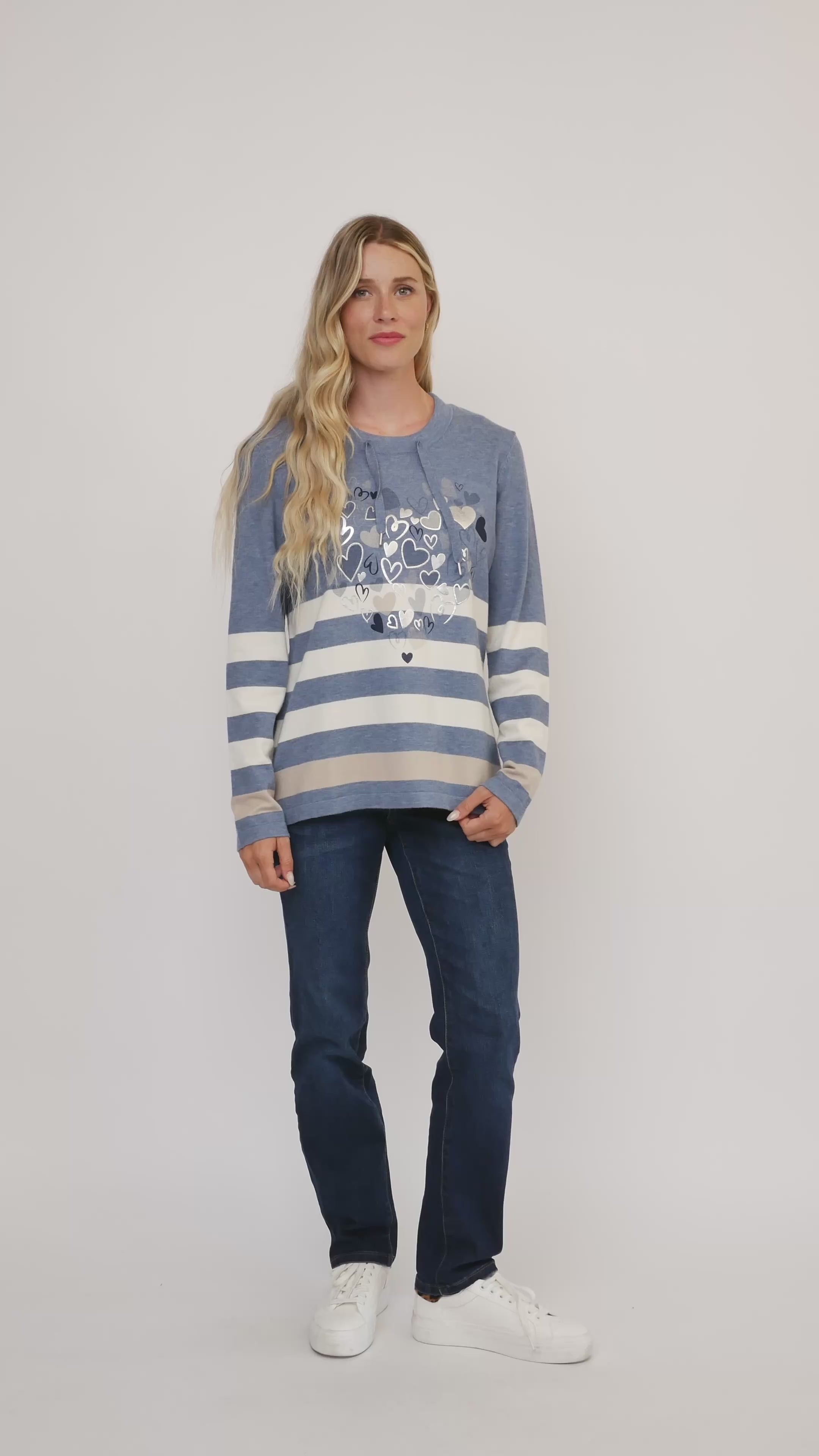 This sweater from Jac Dale features a charming stripe and heart design that adds a fun twist to your wardrobe. Crafted from soft knit fabric, it offers cozy comfort with a flattering round neckline accented by a cute cord detail. Perfect for brightening up chilly days with a touch of whimsy and warmth. Available in Petite and Regular fit.