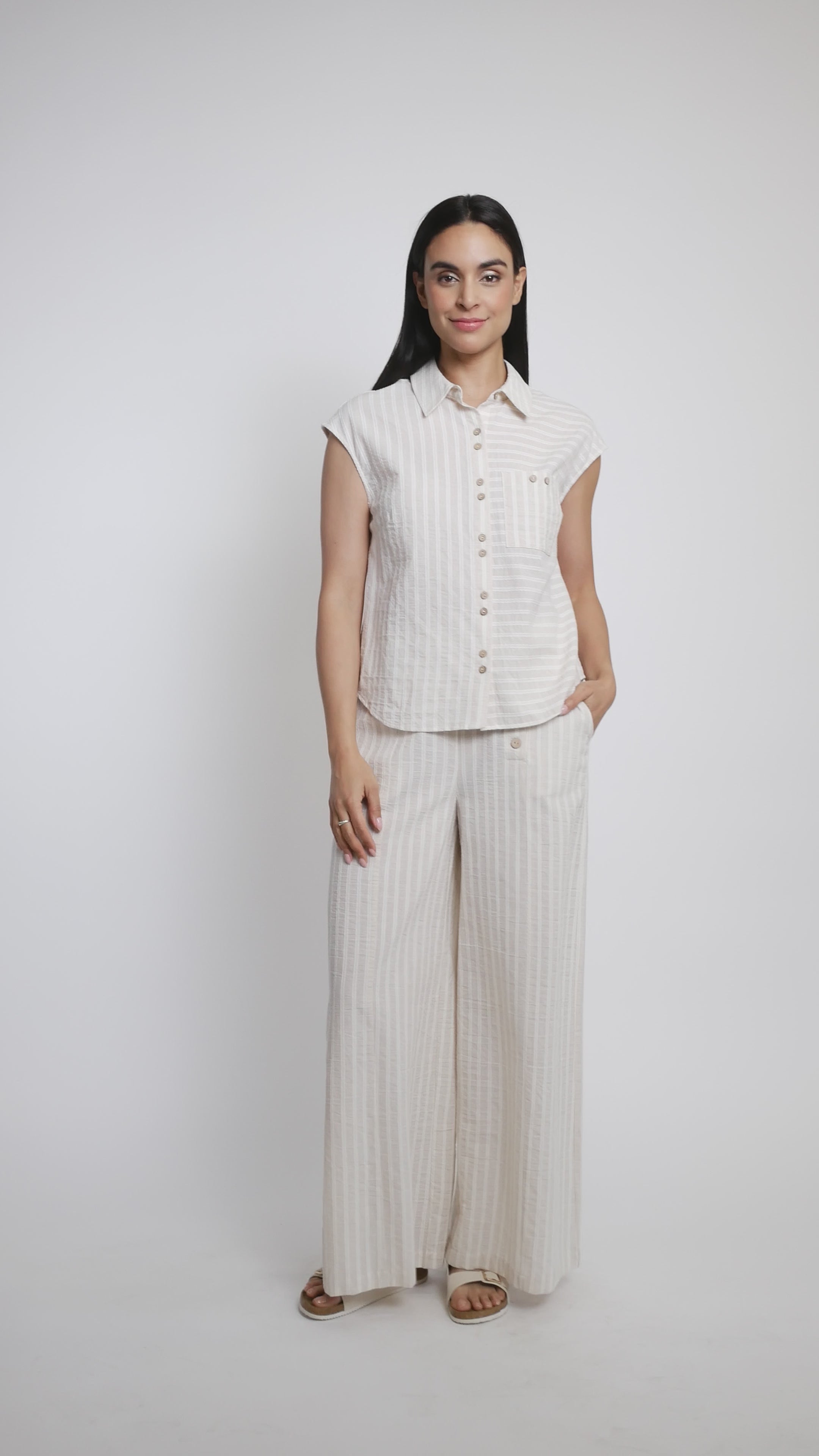 This charming striped cotton blouse from Alison Sheri is your new wardrobe essential! Featuring a crisp shirt collar and button-front closure, it's polished enough for the office yet relaxed enough for weekend adventures. The sleeveless design keeps things breezy, while practical pockets with button details add both function and flair. A gently rounded hemline creates a flattering silhouette that works beautifully with everything in your closet. Pair it with pant style A47341 for an effortlessly coordinated look that feels just right.