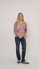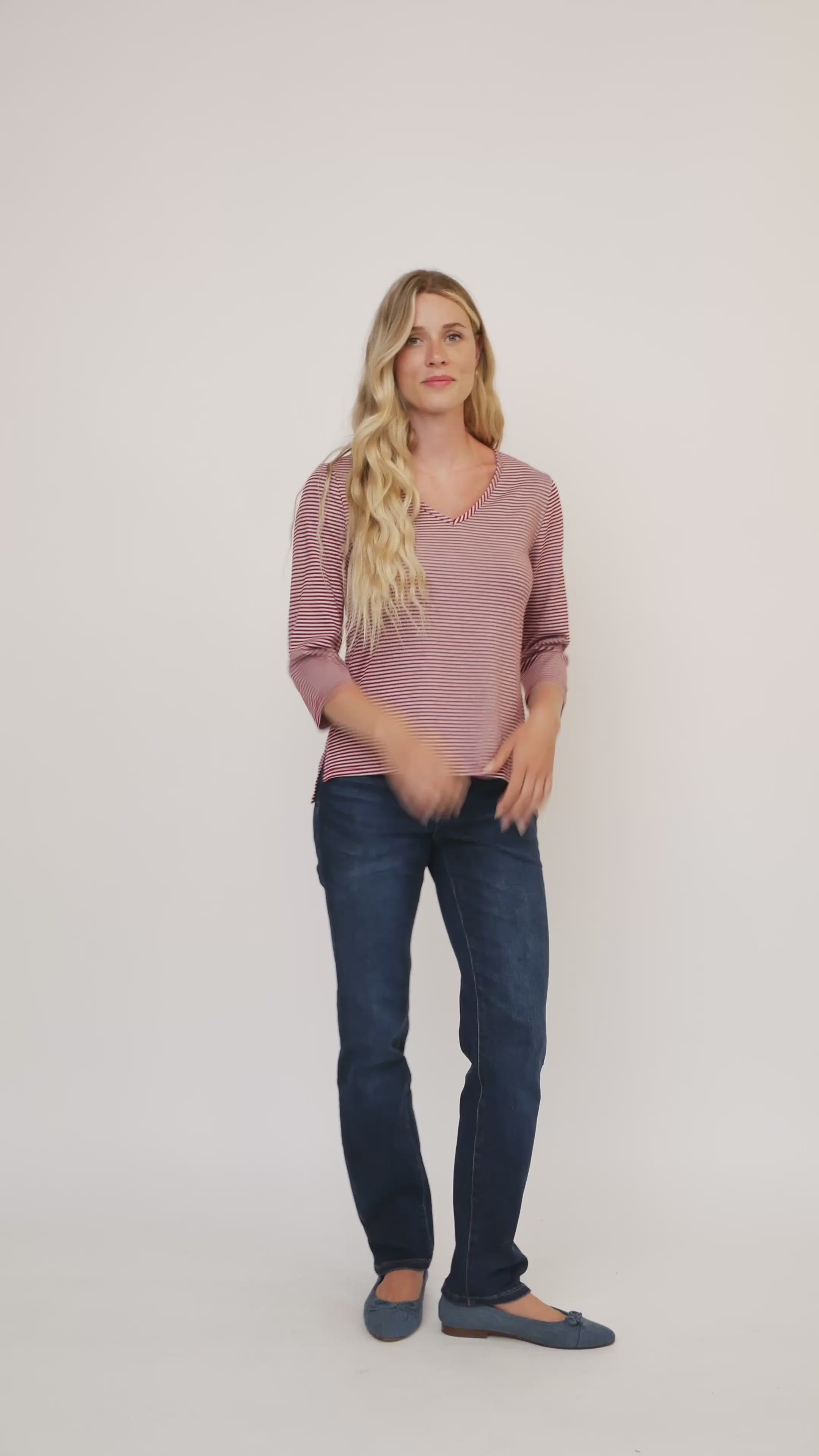 This stripe top features a flattering V-neckline and comfortable 3/4 sleeves, perfect for any casual outing. The side slit detail adds a fun twist, while the soft knit fabric ensures all-day comfort. Proudly made in Canada and exclusively available at Cazza Petite & Zacks Fashions, it’s a stylish addition to your wardrobe with a unique touch.