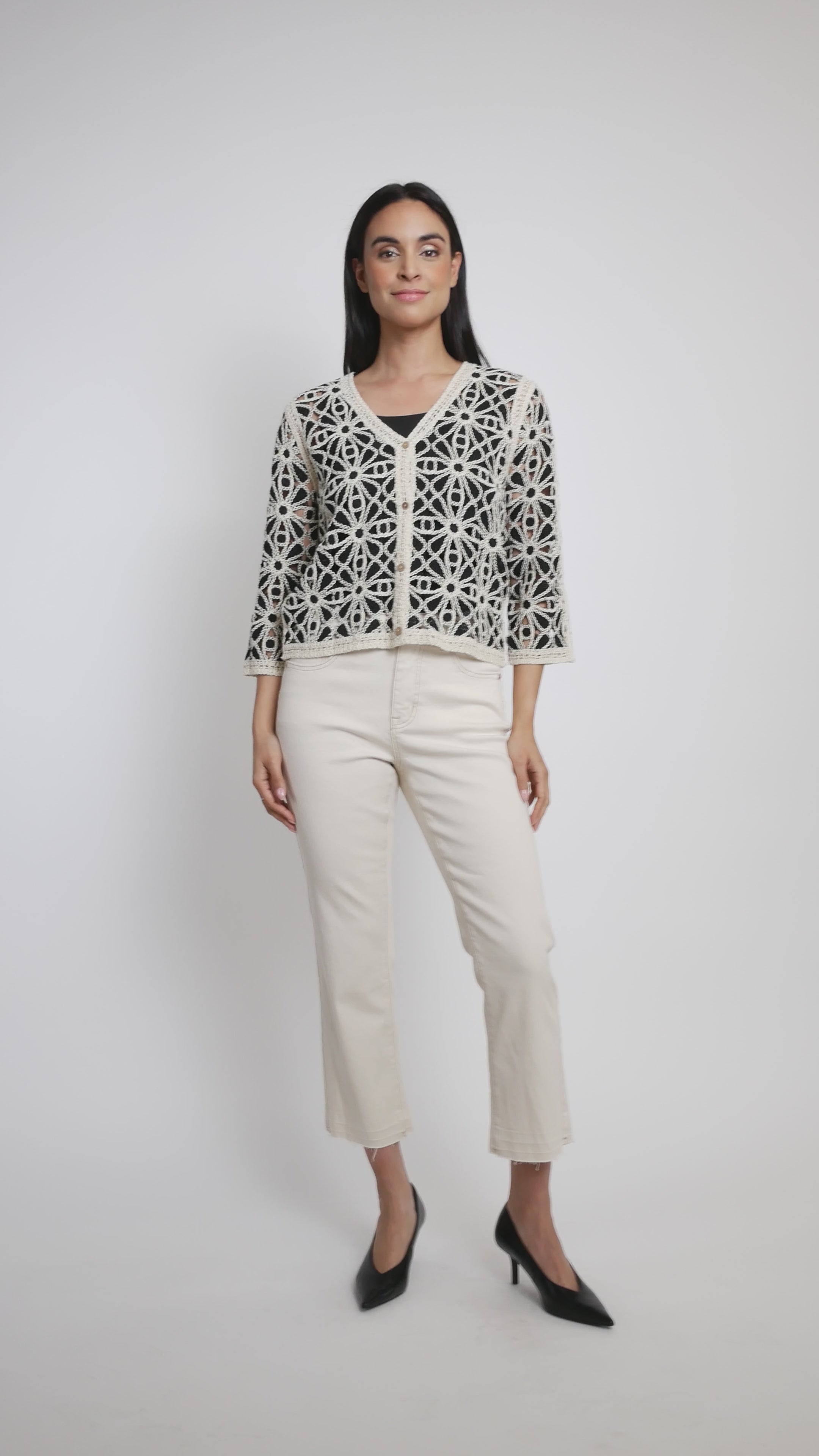 Elevate your layering game with this charming two-tone crochet cardigan by Charlie B. Featuring a flattering V-neckline and convenient button-front closure, it's perfect for throwing over your favorite tee or dress. The delicate crochet fabric adds texture and visual interest, while the three-quarter sleeves offer that just-right coverage. Whether you're heading to brunch or a casual night out, this versatile piece brings effortless style to any outfit.